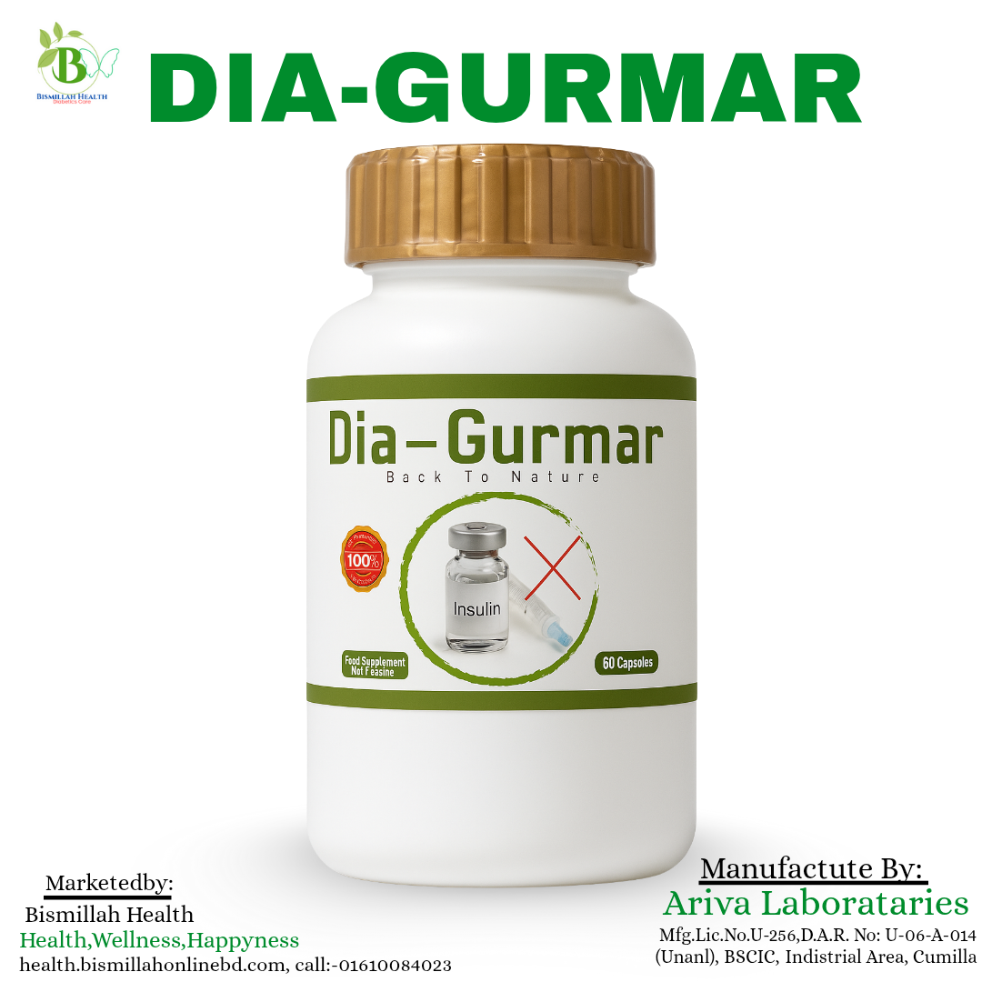 Dia-Gurmar Capsule হল একটি 100% ন্যাচারাল ইউনানী হেলথ সাপ্লিমেন্ট, যা গুরমার পাতার (Gymnema Sylvestre) শক্তি ব্যবহার করে ডায়াবেটিস নিয়ন্ত্রণে সাহায্য করে।